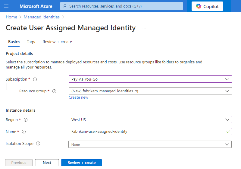 - RegiãoO âmbito efetivo da identidade gerida. Quando terminar, selecione Revisão + criação.