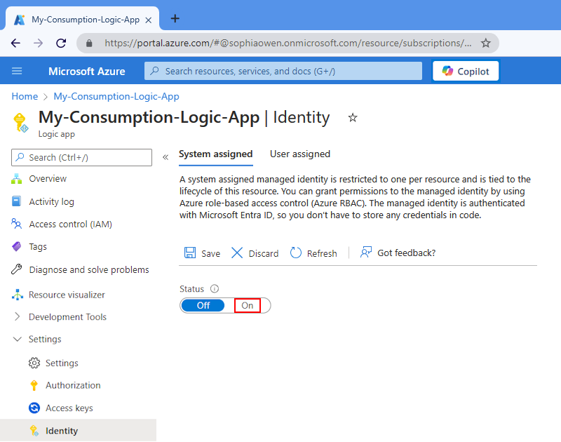 Seu recurso de aplicativo lógico agora pode usar a identidade atribuída ao sistema. Essa identidade é registrada com a ID do Microsoft Entra e é representada por uma ID de objeto.