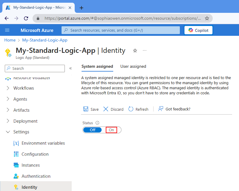 - Configura a identidade atribuída ao sistema no recurso da tua aplicação lógica.