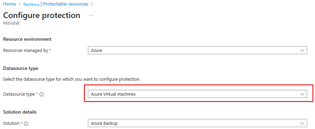 Na folha Configurar proteção, escolha Recursos gerenciados por, selecione Tipo de fonte de dados para o qual você deseja configurar a proteção e, em seguida, selecione a solução (limitada ao Backup do Azure e ao Azure Site Recovery) pela qual você deseja configurar a proteção.