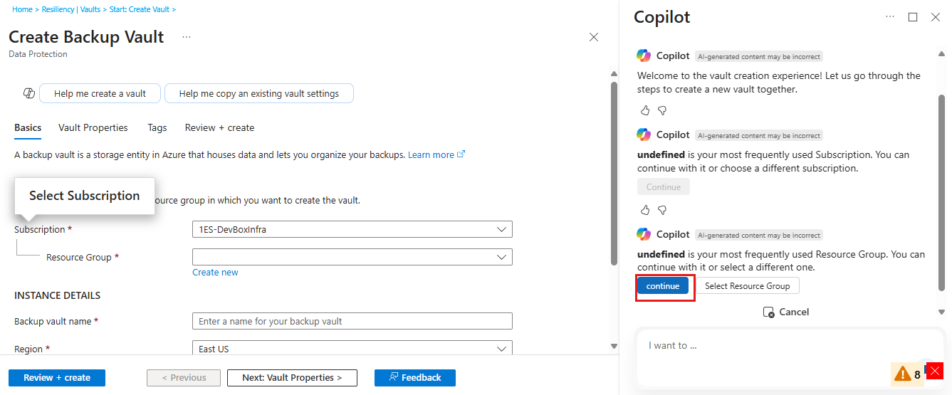 No painel Copilot, é exibido um cofre da região usada com frequência. Para usar o cofre sugerido para copiar as configurações, selecione Continuar.