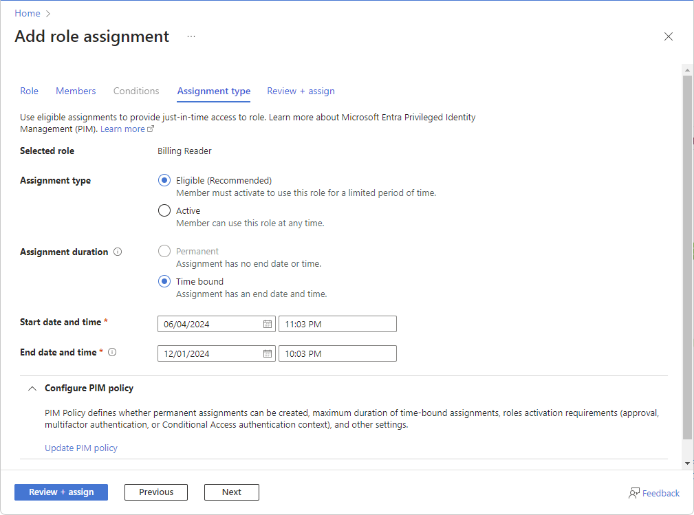 Se você tiver uma licença do Microsoft Entra ID P2 ou do Microsoft Entra ID Governance, o Microsoft Entra Privileged Identity Management (PIM) será integrado às etapas de atribuição de função. Por exemplo, você pode atribuir funções a usuários por um período de tempo limitado. Você também pode tornar os utilizadores elegíveis para atribuições de funções, para que eles tenham que ativarem para utilizarem a função, tal como o pedido de aprovação. As atribuições de função qualificadas permitem acesso temporário a uma função por tempo limitado.