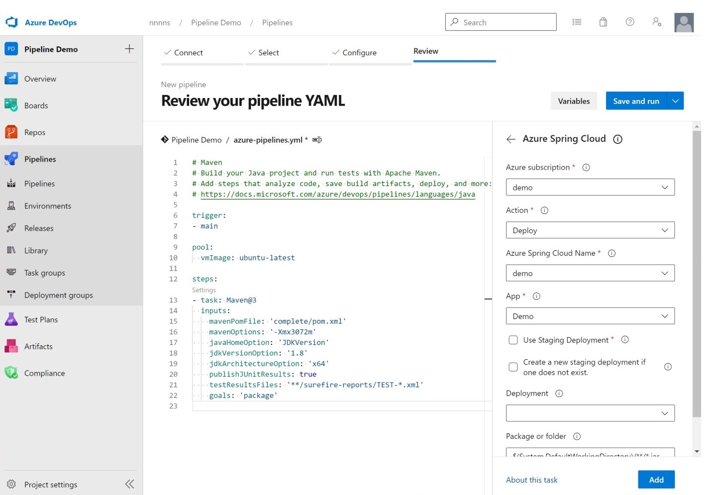 Agora você pode criar e implantar seus projetos usando uma série de tarefas. O modelo Azure Pipelines a seguir define variáveis, uma tarefa .NET Core para criar o aplicativo e uma tarefa do Azure Spring Apps para implantar o aplicativo.