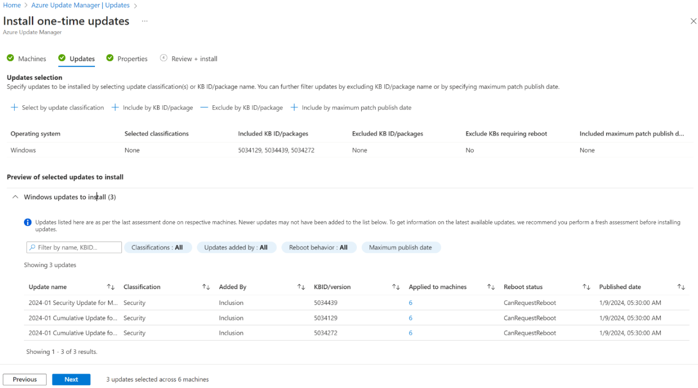 Filtre atualizações usando as opções de filtro na parte superior, como Grupo de recursos, Local, Tipo de recurso, Cargas de trabalho, Classificações de atualização