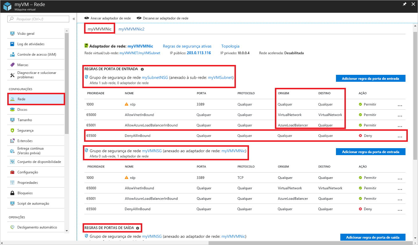 Expanda Rede no painel esquerdo. Selecione Configurações de rede. As figuras a seguir mostram as configurações do grupo de segurança de rede para a interface de rede da VM.