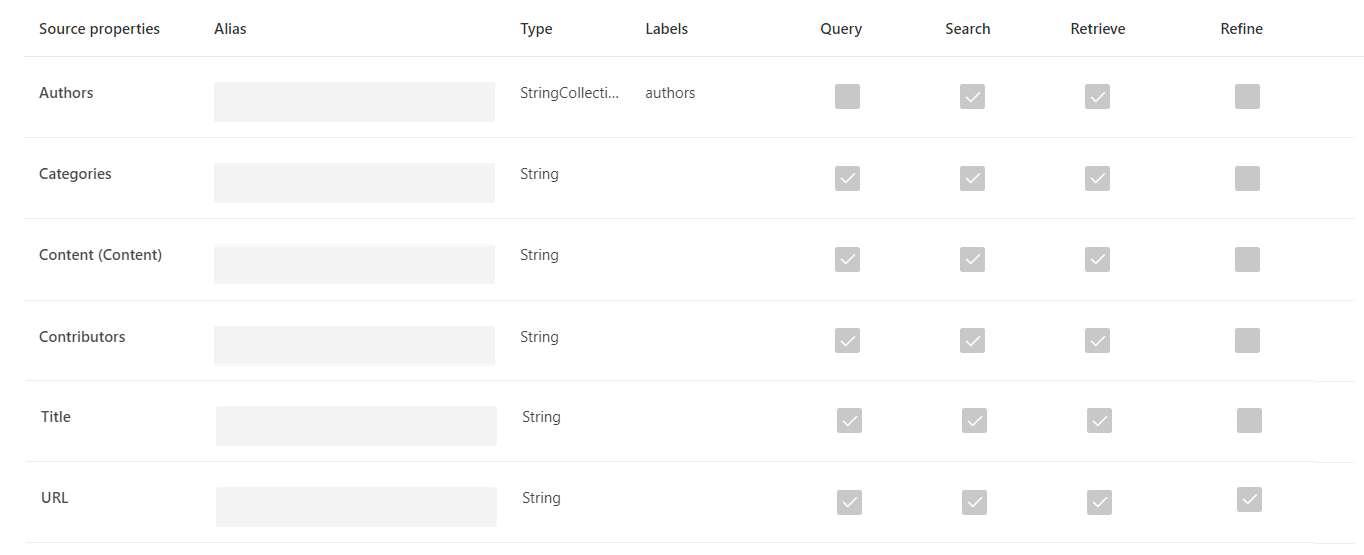 Pode adicionar aliases às propriedades na coluna "Alias". Aliases são nomes amigáveis para suas propriedades. Eles são usados em consultas e na criação de filtros. Também são utilizadas para normalizar as propriedades de origem de múltiplas ligações de modo a que tenham o mesmo nome. Desta forma, pode criar um único filtro para um vertical com múltiplas ligações. Para obter mais informações, consulte Personalizar a página de resultados da pesquisa.