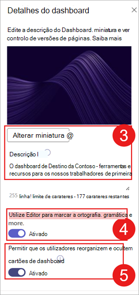 No painel Detalhes do dashboard, pode adicionar uma miniatura e uma descrição para mostrar nos resultados da pesquisa: