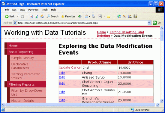 Neste tutorial, examinaremos o uso dos eventos que ocorrem antes, durante e depois de uma operação de inserção, atualização ou exclusão de um controle da Web de dados ASP.NET. Também veremos como personalizar a interface de edição para atualizar apenas um subconjunto dos campos do produto.