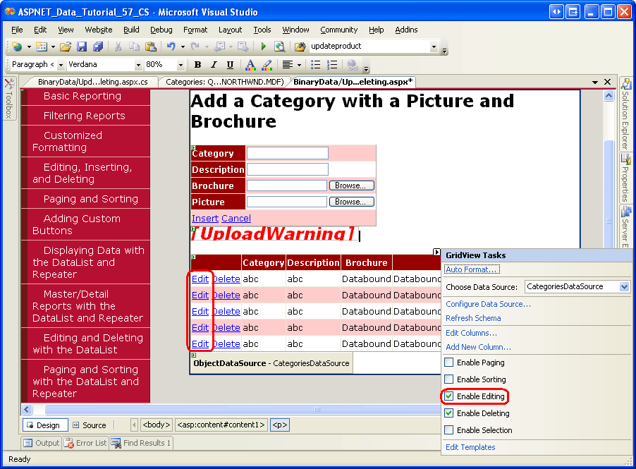 No tutorial anterior , criamos uma página chamada UploadInDetailsView.aspx que listava todas as categorias em um GridView e fornecíamos um DetailsView para adicionar novas categorias ao sistema. Neste tutorial, estenderemos o GridView para incluir o suporte à edição e exclusão. Em vez de continuar a trabalhar a partir do UploadInDetailsView.aspx, vamos colocar as alterações deste tutorial na UpdatingAndDeleting.aspx página da mesma pasta, ~/BinaryData. Copie e cole a marcação declarativa e o código de UploadInDetailsView.aspx para UpdatingAndDeleting.aspx.