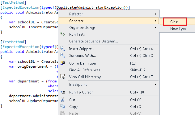 Você ainda não criou a classe de exceção, portanto, esse código não será compilado. Para que ele seja compilado, clique com o botão DuplicateAdministratorException direito do mouse e selecione Gerar e, em seguida, Classe.