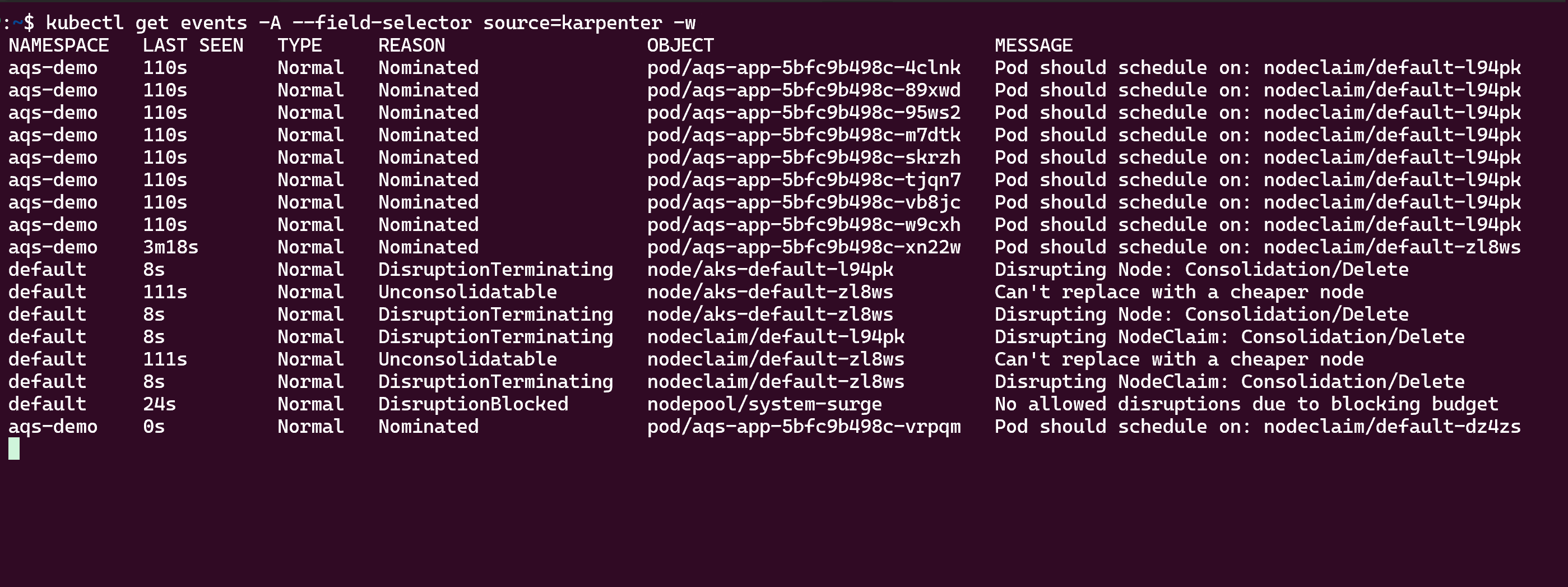aks-defaultaumentou de um para três nós. Se parar o aplicativo produtor de colocar mensagens na fila, eventualmente os consumidores reduzirão a profundidade da fila abaixo do limite, e tanto o KEDA quanto o Karpenter farão escala para dentro. Se você estiver usando k9s, você verá algo assim:Finalmente, você pode visualizar a atividade de dimensionamento automático do Karpenter usando o comando,
