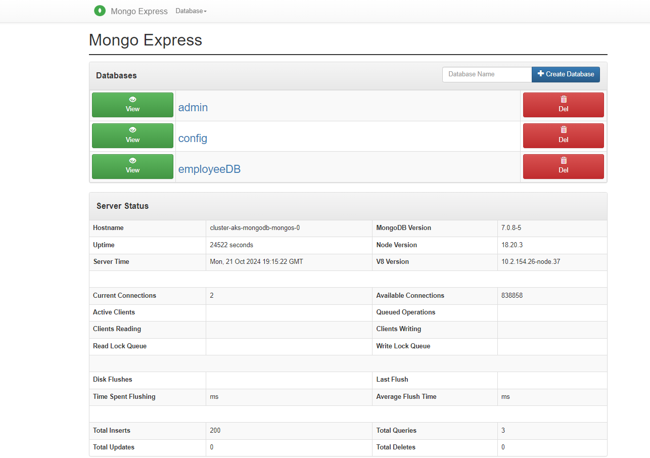 kubectl applycomando:kubectl apply -f -<<EOF apiVersion: v1 kind: Service metadata: name: mongo-express namespace: ${AKS_MONGODB_NAMESPACE} spec: type: LoadBalancer ports: - port: 8081 # Service port for HTTP access targetPort: 8081 # Container port for Mongo Express selector: app: mongo-express --- apiVersion: apps/v1 kind: Deployment metadata: name: mongo-express namespace: ${AKS_MONGODB_NAMESPACE} spec: replicas: 1 selector: matchLabels: app: mongo-express template: metadata: labels: app: mongo-express spec: containers: - name: mongo-express image: mongo-express ports: - containerPort: 8081 env: - name: ME_CONFIG_MONGODB_SERVER valueFrom: secretKeyRef: name: ${AKS_MONGODB_SECRETS_NAME} key: MONGODB_CONFIG_SERVER - name: ME_CONFIG_BASICAUTH_USERNAME valueFrom: secretKeyRef: name: ${AKS_MONGODB_SECRETS_NAME} key: MONGOEXPRESS_CONFIG_BASICAUTH_USERNAME - name: ME_CONFIG_BASICAUTH_PASSWORD valueFrom: secretKeyRef: name: ${AKS_MONGODB_SECRETS_NAME} key: MONGOEXPRESS_CONFIG_BASICAUTH_PASSWORD - name: ME_CONFIG_MONGODB_PORT value: "27017" - name: ME_CONFIG_MONGODB_ADMINUSERNAME valueFrom: secretKeyRef: name: ${AKS_MONGODB_SECRETS_NAME} key: MONGODB_DATABASE_ADMIN_USER - name: ME_CONFIG_MONGODB_ADMINPASSWORD valueFrom: secretKeyRef: name: ${AKS_MONGODB_SECRETS_NAME} key: MONGODB_DATABASE_ADMIN_PASSWORD EOFSaída de exemplo:
