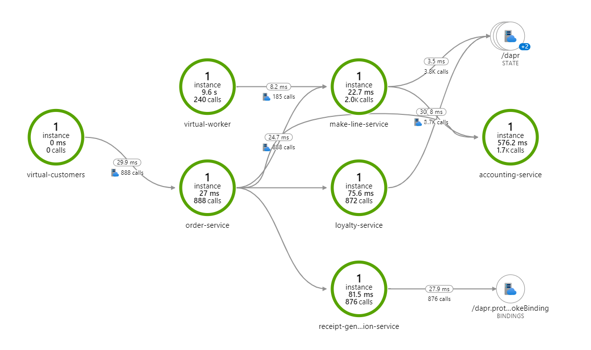 O mapa do aplicativo no Application Insights também mostra como os serviços se comunicam em tempo real. Em seguida, você pode usá-los para depurar cenários. Navegue até o mapa do aplicativo no recurso do Application Insights para exibir algo como o mapa a seguir.