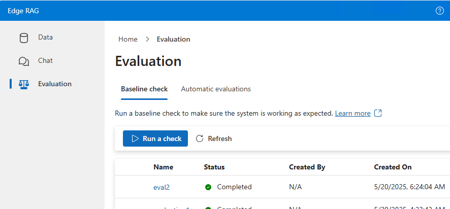 Avalie o sistema, os modelos e os conjuntos de dados no Edge RAG Preview, habilitado pelo Azure Arc. Existem dois tipos de avaliações: basal e automática.