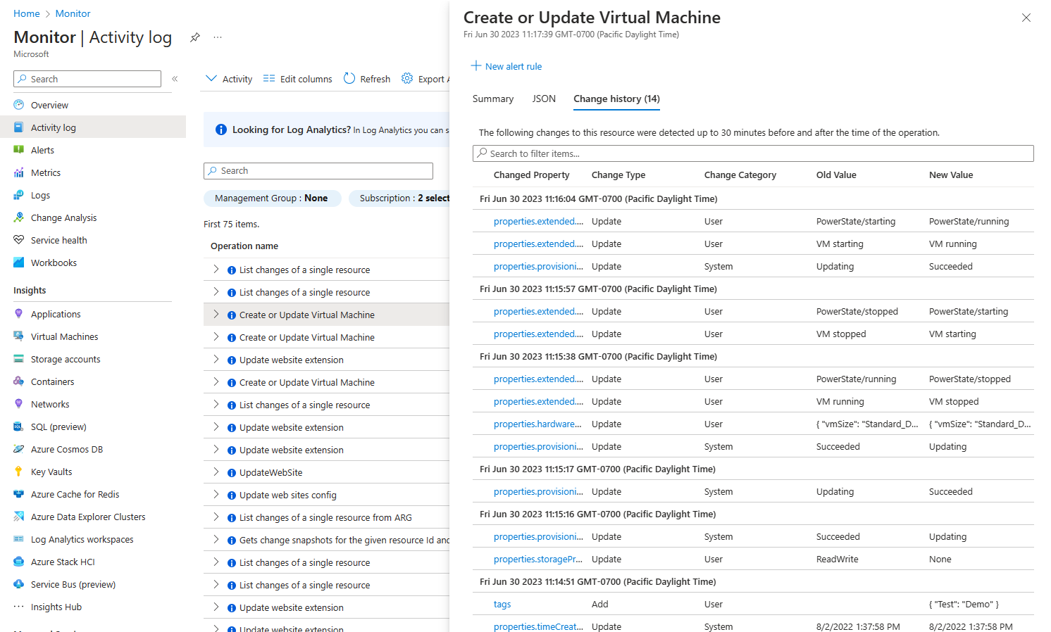 Para alguns eventos, pode ver o histórico de alterações, que mostra as alterações ocorridas durante o tempo desse evento. Selecione um evento no registro de atividades que você deseja examinar mais profundamente. Selecione a guia Histórico de alterações para visualizar quaisquer alterações no recurso até 30 minutos antes e depois do horário da operação.
