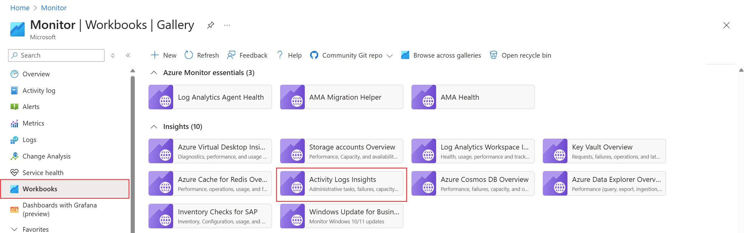 Você pode abrir os insights de registo de atividades ao nível da subscrição ou do recurso. Para a subscrição, selecione Activity Logs Insights na seção Workbooks do menu Monitor.