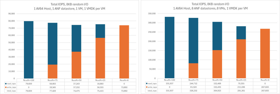 Os gráficos a seguir comparam as E/S de uma única máquina virtual em um único armazenamento de dados do Azure NetApp Files com as E/S agregadas de oito armazenamentos de dados do Azure NetApp Files. Em ambos os cenários, cada máquina virtual tem um VMDK em cada armazenamento de dados do Azure NetApp Files.
