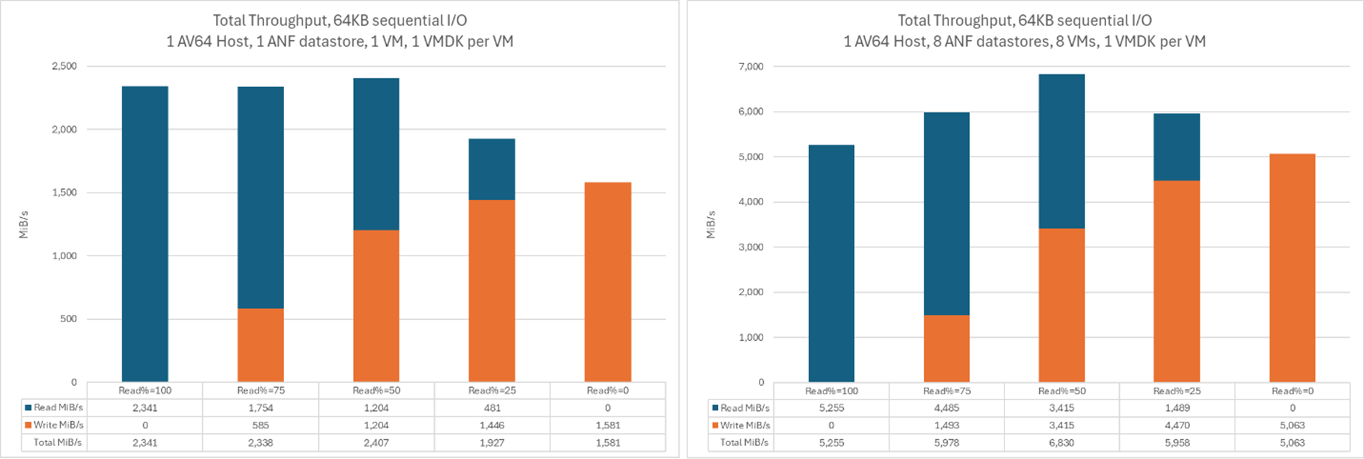 Os gráficos a seguir comparam a taxa de transferência de uma única máquina virtual em um único armazenamento de dados do Azure NetApp Files com a taxa de transferência agregada de oito VMs, cada uma em seus próprios armazenamentos de dados do Azure NetApp Files. Uma taxa de transferência semelhante pode ser alcançada por um número menor de VMs com VMDKs adicionais espalhadas pelo mesmo número de armazenamentos de dados.
