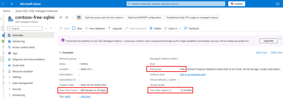 Selecione a instância gratuita que quer atualizar para navegar até à página Overview para a SQL Managed Instance.