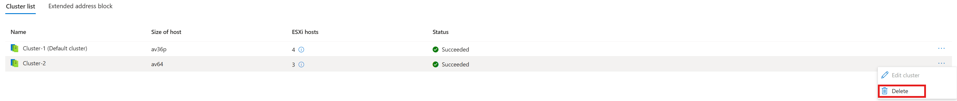 Selecione o Cluster que pretende eliminar, selecione Mais (...), selecione Eliminar.