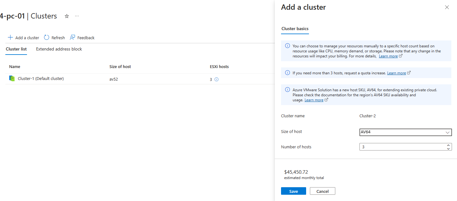 Se você estiver planejando usar o AV64 SKU, defina uma rede para o plano de gerenciamento e controle. Na nuvem privada da Solução VMware do Azure, em Gerenciar, selecione Clusters>Adicionar um cluster. Em seguida, adicione o bloco de endereços para clusters AV64 (uma rede /23 ou três redes /25) na guia Bloco de endereço estendido e selecione Guardar.
