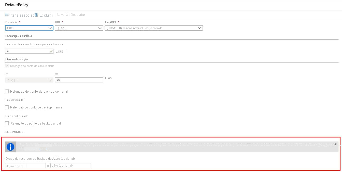 Para configurar o grupo de recursos do Backup do Azure para VMs usando o PowerShell, consulte Criar um grupo de recursos do Backup do Azure durante a retenção de instantâneo.