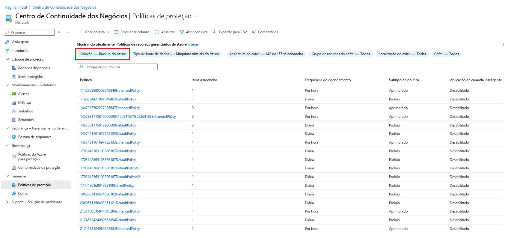 Todas as políticas de backup configuradas no seu cofre são exibidas.