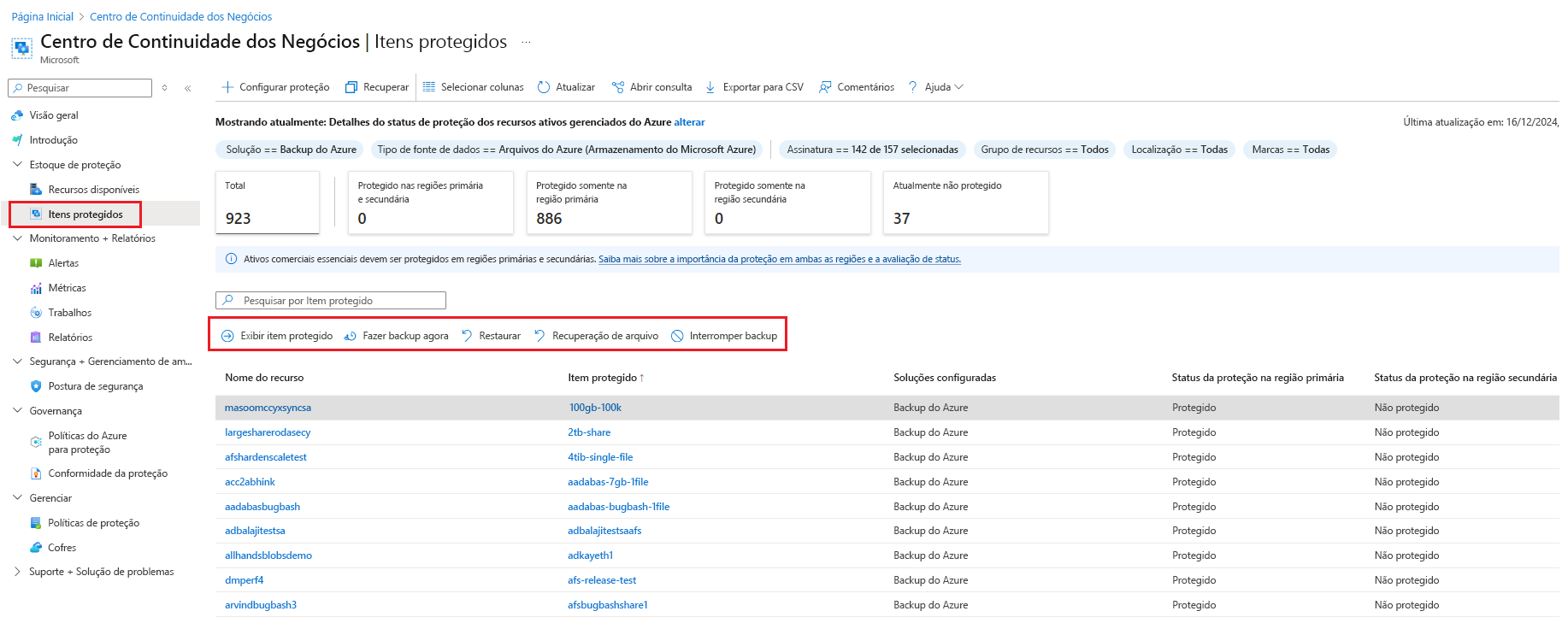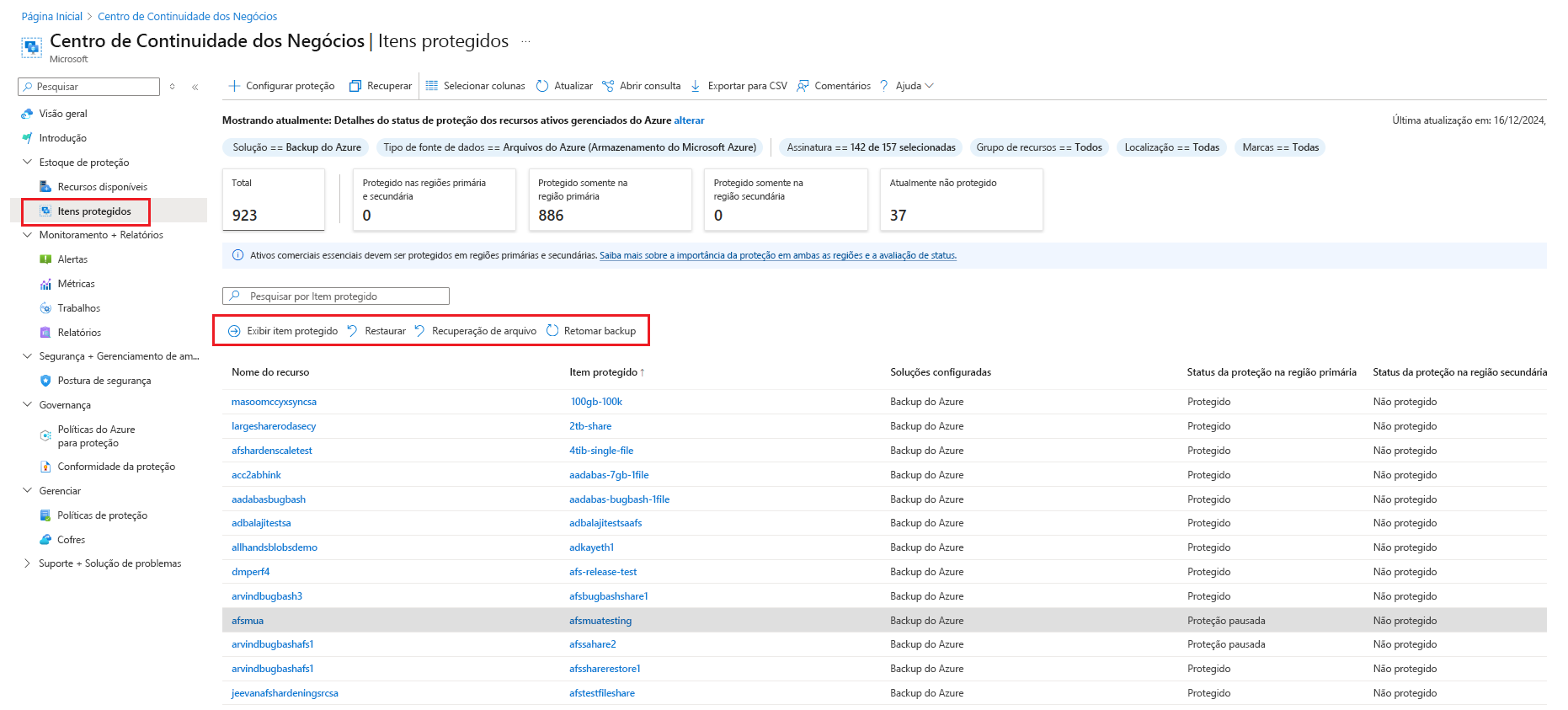 Vá a Resiliência>Itens Protegidos e depois selecione Azure Backup como Solução e Azure Files (Azure Storage) como Tipo de fonte de dados.