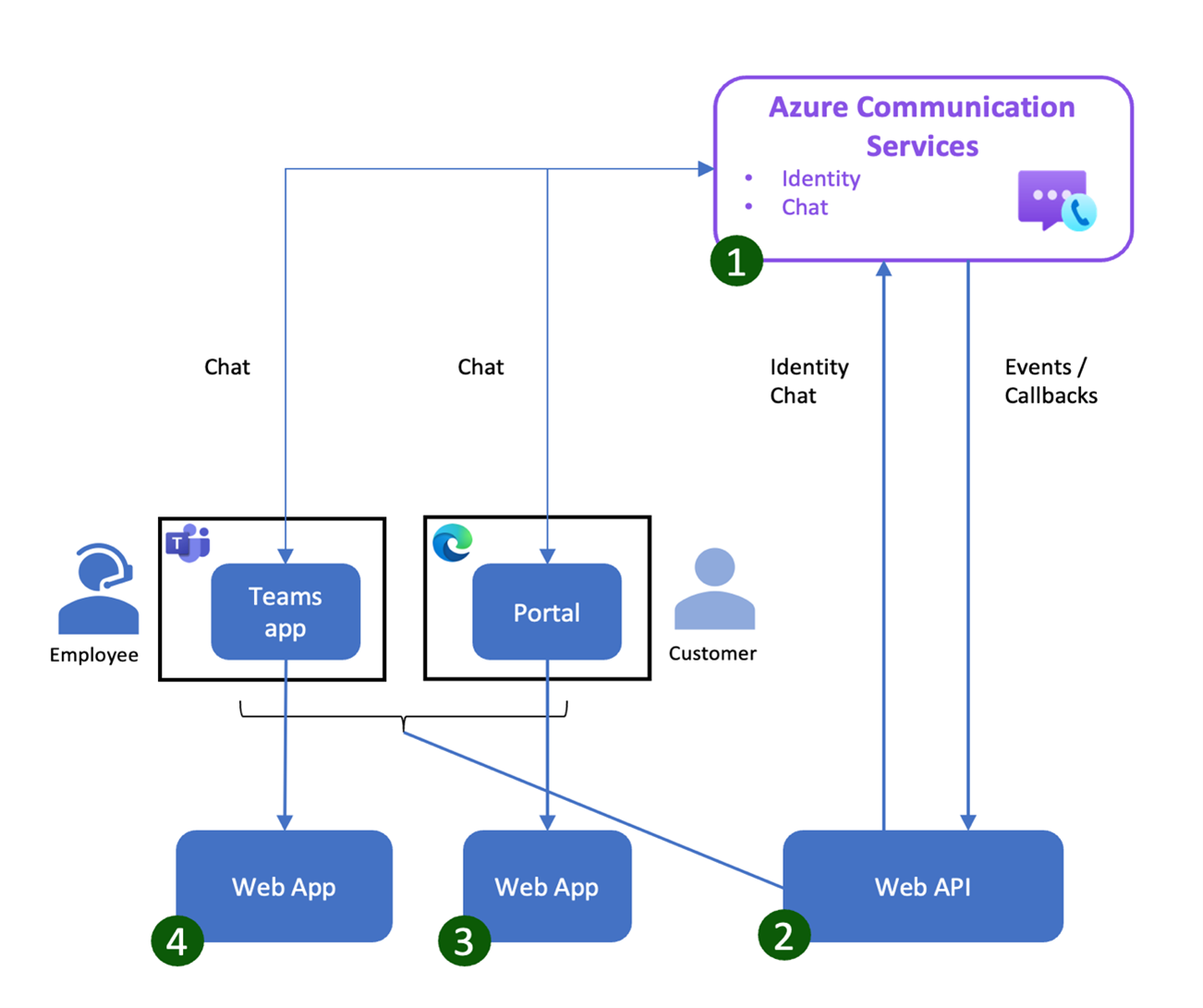 Os sites de consumidores podem fornecer um acesso rápido a um canal de bate-papo, seja para bots automatizados ou associados de vendas ou ambos. Recomendamos o uso de uma instância isolada do Serviço de Comunicação do Azure.