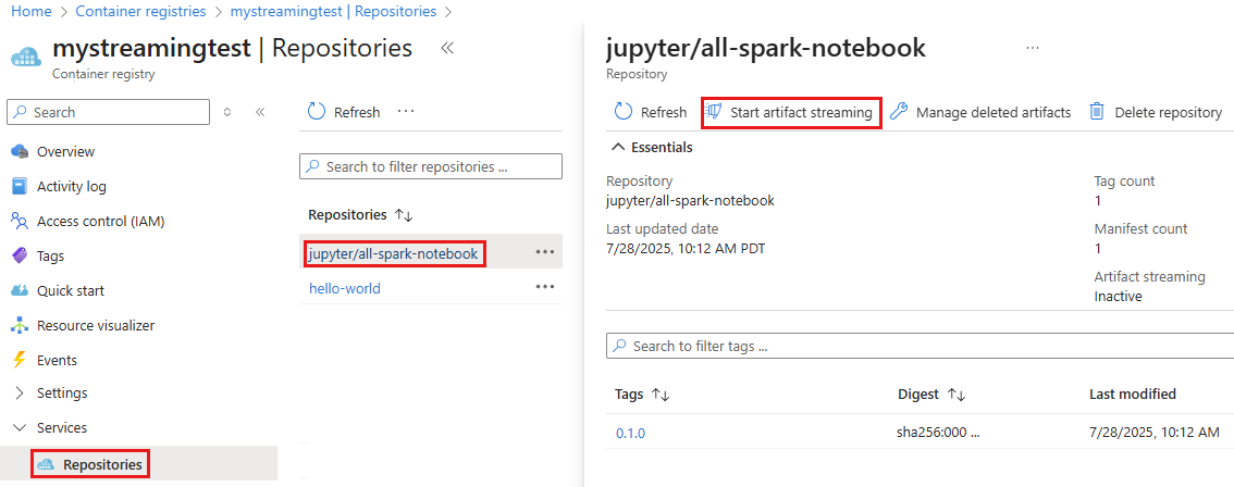 az acr artifact-streaming update --repository jupyter/all-spark-notebook --enable-streaming true