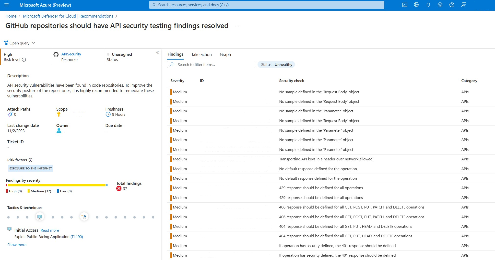 Os resultados da verificação de segurança de aplicativos parceiros estão disponíveis no Defender for Cloud. A capacidade de visualizar os resultados no Defender for Cloud garante que as equipes centrais de segurança tenham visibilidade sobre a integridade das APIs dentro da experiência de recomendação do Defender for Cloud. Essas equipes de segurança agora podem executar etapas de governança que estão disponíveis nativamente por meio das recomendações do Defender for Cloud e extensibilidade para exportar resultados de verificação do Gráfico de Recursos do Azure para ferramentas de gerenciamento de sua escolha.