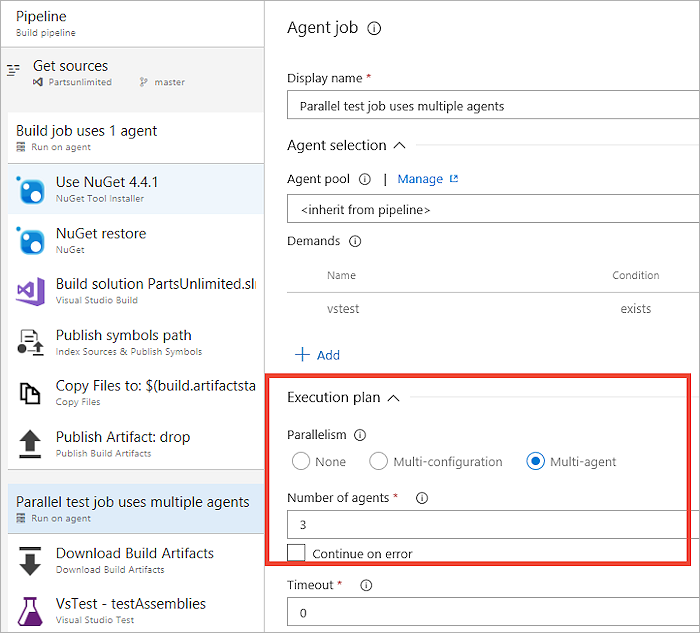 A tarefa de teste do Visual Studio (versão 2) foi projetada para funcionar perfeitamente com configurações de trabalho paralelo. Quando um trabalho de pipeline que contém a tarefa de teste do Visual Studio (referida como a "tarefa VSTest" para simplificar) é configurado para ser executado em vários agentes em paralelo, ele deteta automaticamente que vários agentes estão envolvidos e cria fatias de teste que podem ser executadas em paralelo entre esses agentes.
