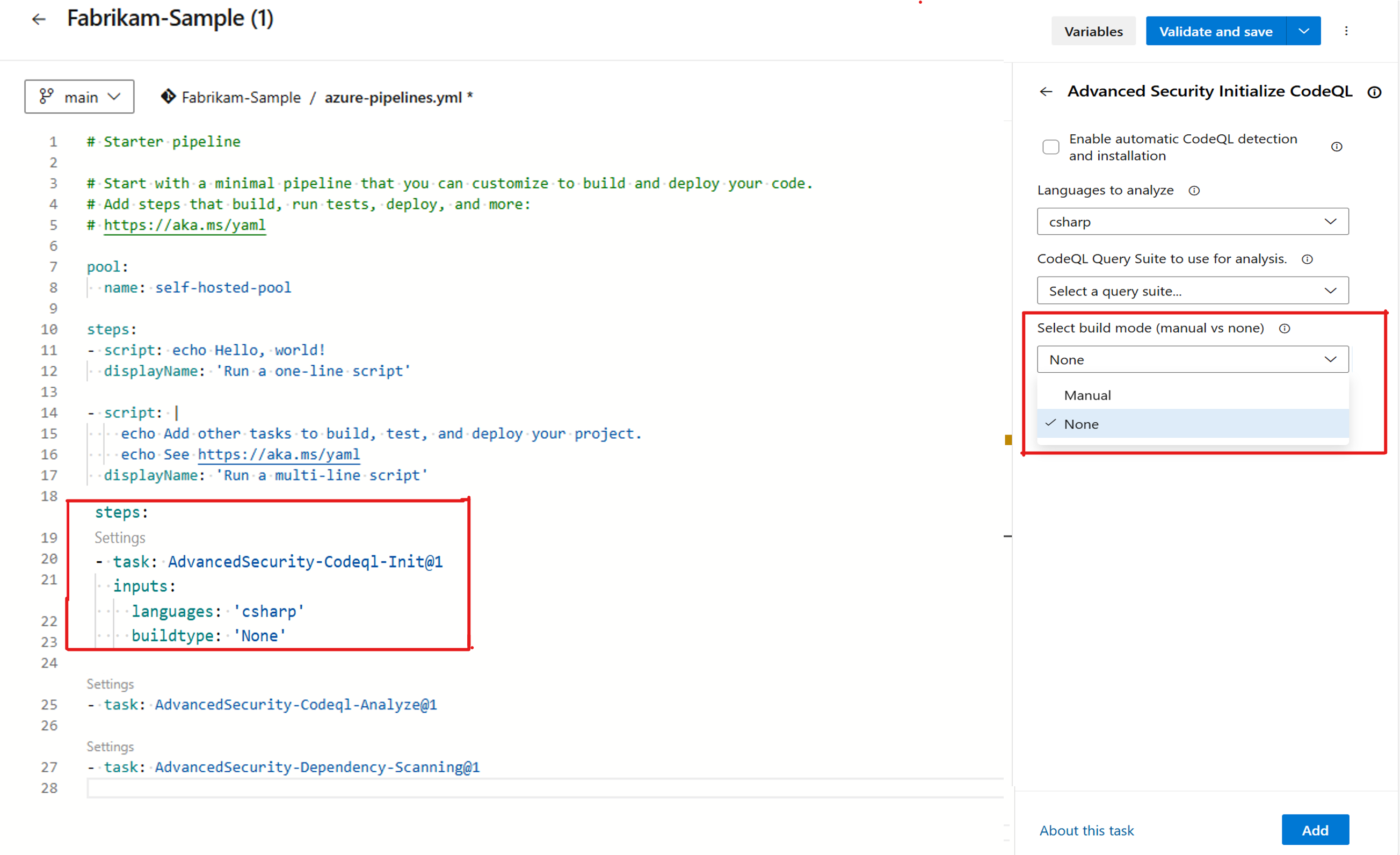 No entanto, o CodeQL, o mecanismo de análise estática por trás do GitHub Advanced Security for Azure DevOps, agora pode verificar projetos C# e Java sem precisar de uma compilação. Quando o modo de compilação é definido como "nenhum", o banco de dados CodeQL é gerado diretamente da base de código, ignorando a etapa de compilação.