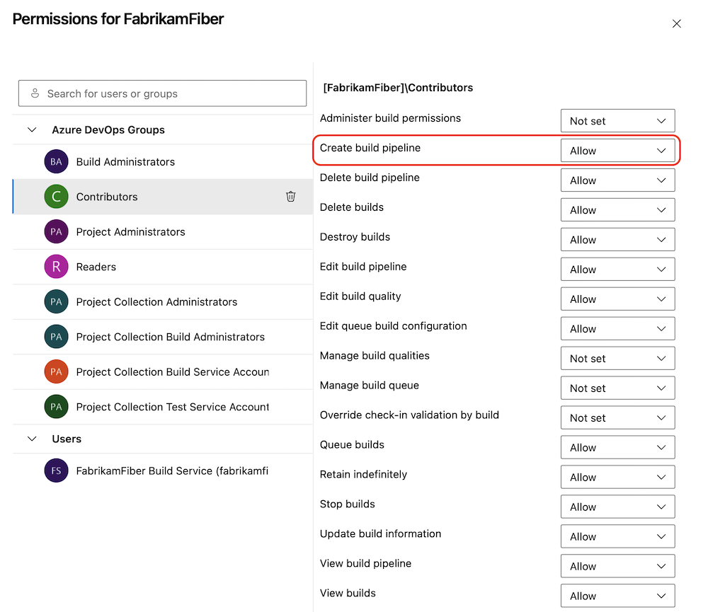 Para aumentar a segurança dos oleodutos, estamos introduzindo uma nova permissão, Create build pipelineno nível dos oleodutos.