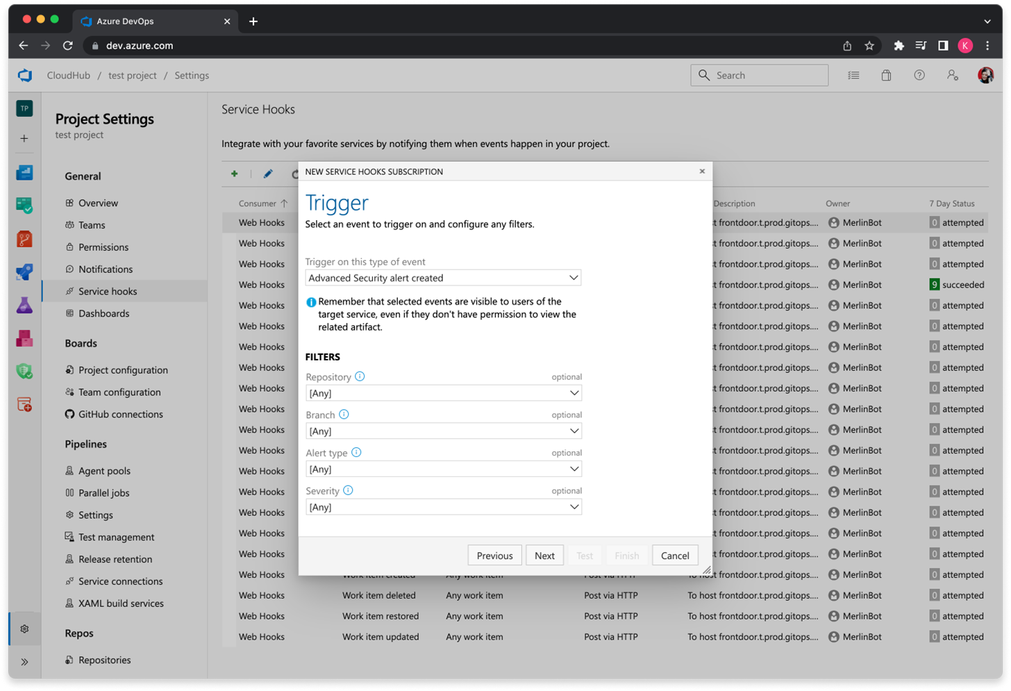 Ganchos de serviço para os alertas do GitHub Advanced Security para Azure DevOps estão agora disponíveis