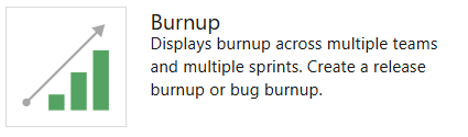 Exibe um gráfico de burnup que você pode configurar para abranger uma ou mais equipes, tipos de item de trabalho e período de tempo. Com ele, pode criar um gráfico de burnup de lançamento, um gráfico de burnup de sprint ou qualquer gráfico de burnup que abranja equipas e sprints.