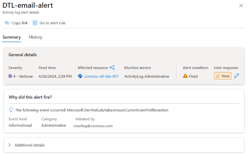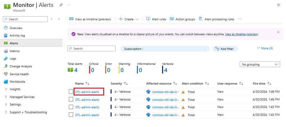 Neste exemplo, você cria um alerta para todas as operações administrativas em um laboratório com uma ação que envia um email aos proprietários da assinatura.