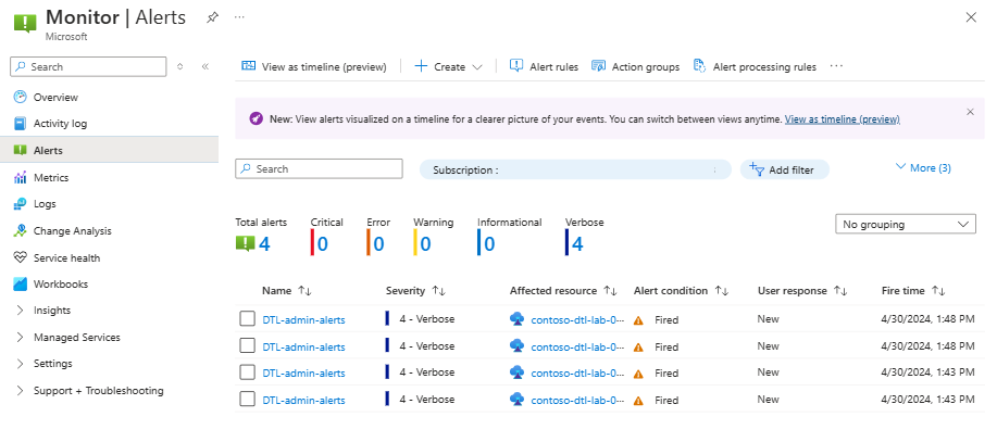 Você verá alertas nos Alertas para todas as operações administrativas (neste exemplo). Os alertas podem demorar algum tempo a aparecer.
