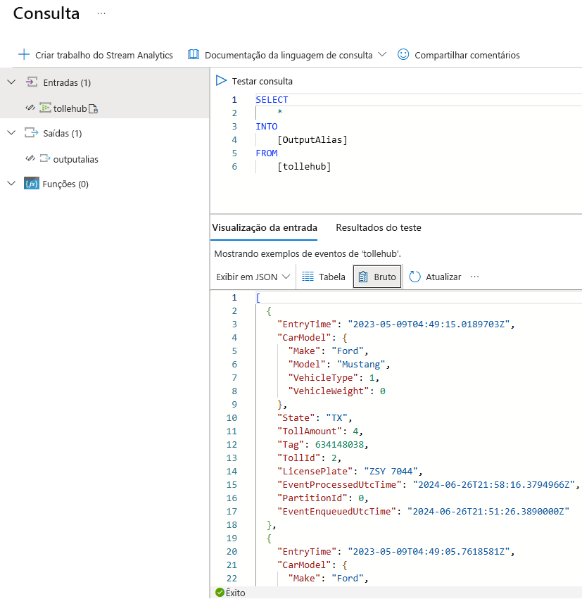 Opção 3: O usuário pode criar o trabalho do Azure Stream Analytics. Defina a entrada como este hub de eventos e navegue até "Consulta" para visualizar os dados recebidos desse hub de eventos.