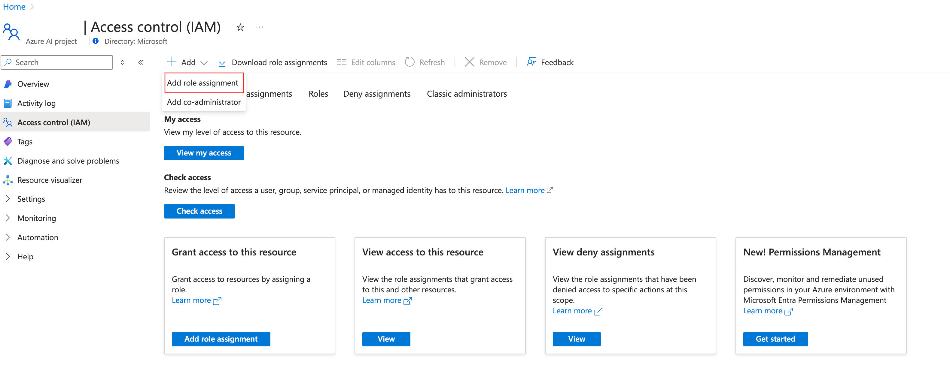 Selecione Access control (IAM), e depois selecione Adicionar atribuição de funções.