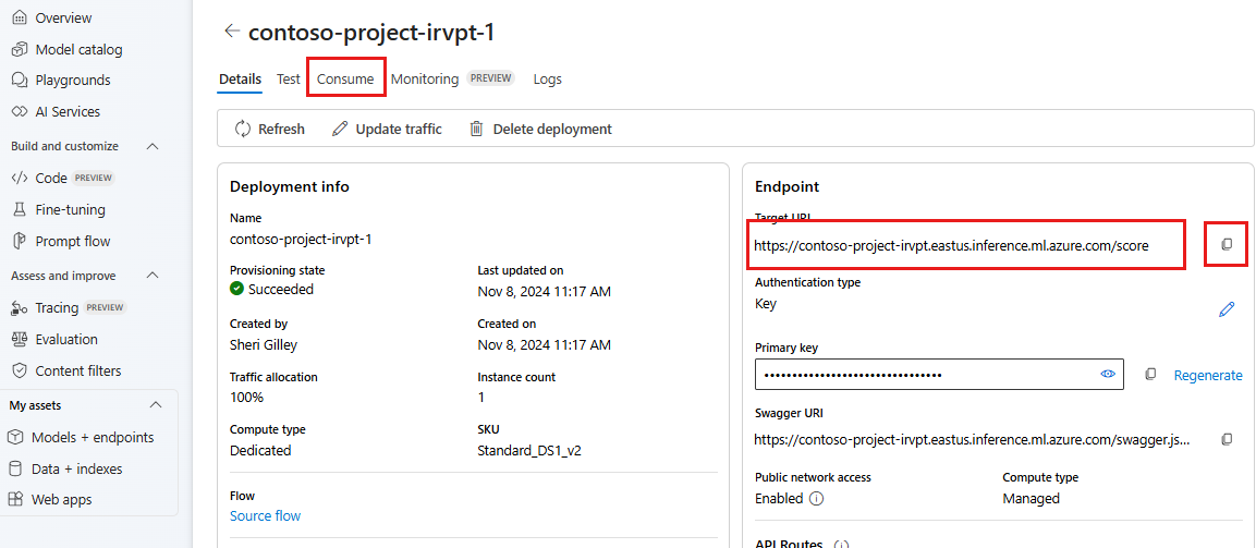 Nesta página, você também pode ver a URL do ponto de extremidade que pode ser usada para consumir o ponto de extremidade.
