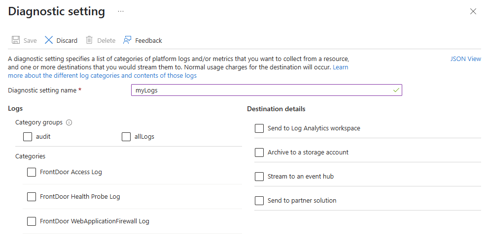 Os logs de acesso, os logs de investigação de integridade e os logs do Web Application Firewall (WAF) não são habilitados por padrão. Neste artigo, você aprenderá a habilitar logs de diagnóstico para seu perfil do Azure Front Door.
