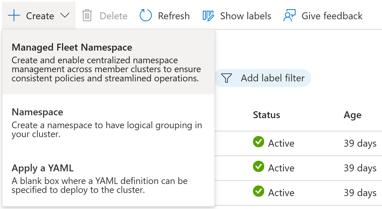 Pode criar um novo Espaço de Nomes de Frota Gerido a partir do Gestor de Frotas, ou através do centro Kubernetes.