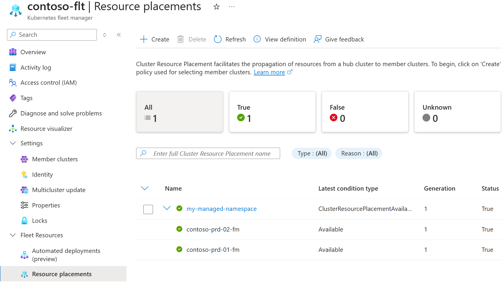 Para rever a implementação do namespace do Kubernetes entre clusters, use Resource placements, procurando pelo resource placement com o mesmo nome que o Managed Fleet Namespace.