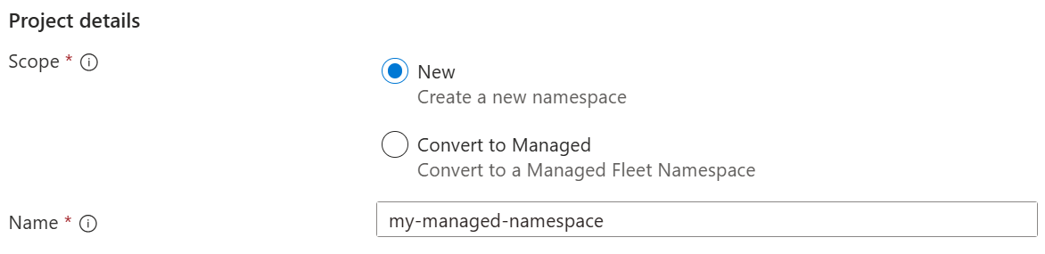 - Novo - criar um novo namespace Kubernetes que não existe no cluster do Hub do Fleet Manager. Introduza um Nome para o novo espaço de nomes.