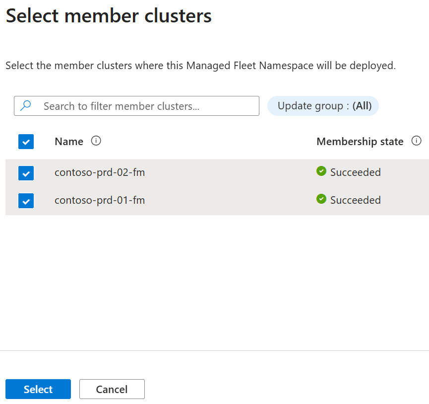 - Por fim, escolha Selecionar para adicionar os clusters de membros.