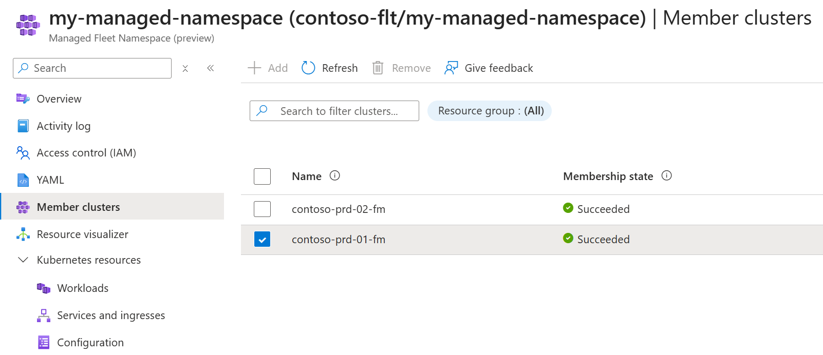 Na visão geral do Espaço de Nomes da Frota Gerida, selecione clusters membros na navegação à esquerda.