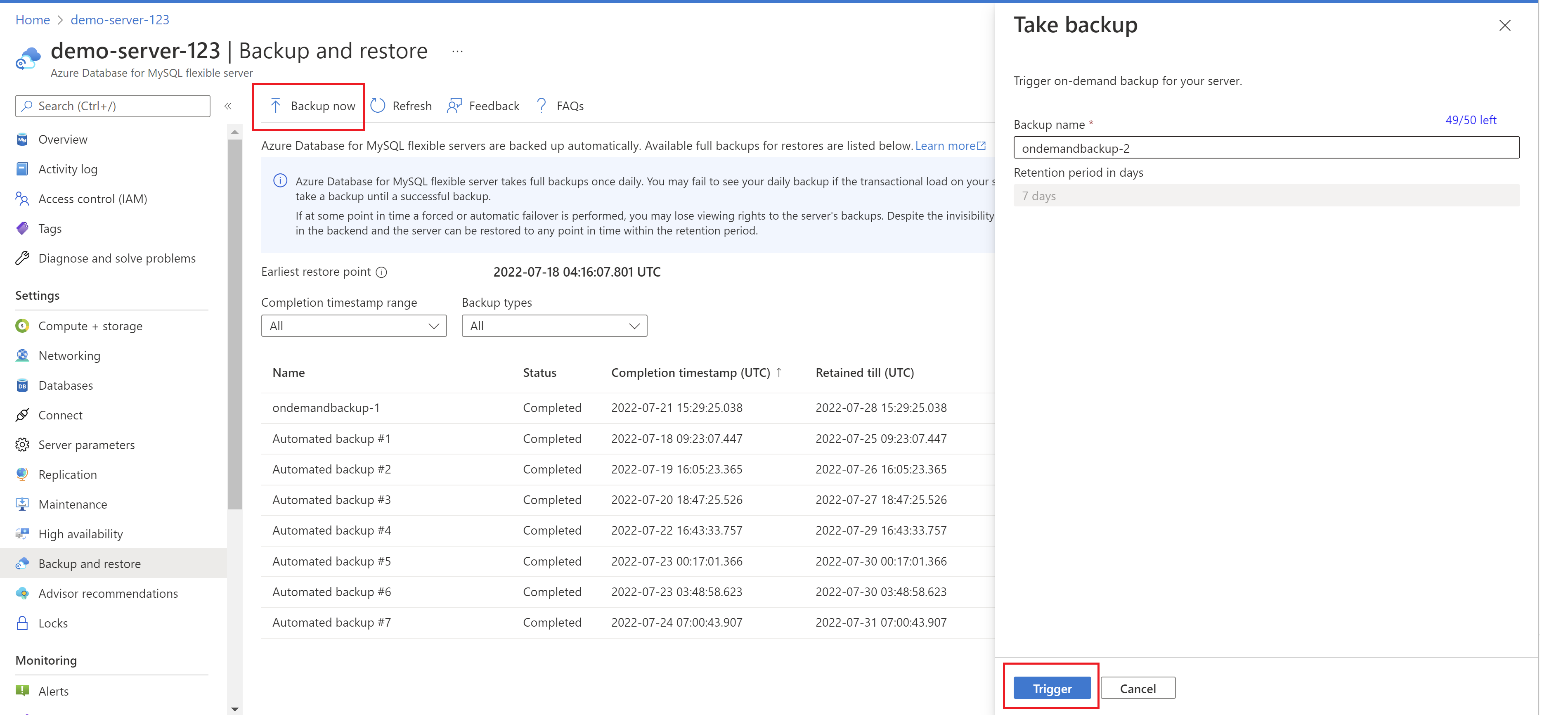 Este artigo fornece um procedimento passo a passo para disparar um backup sob demanda do portal do Azure.