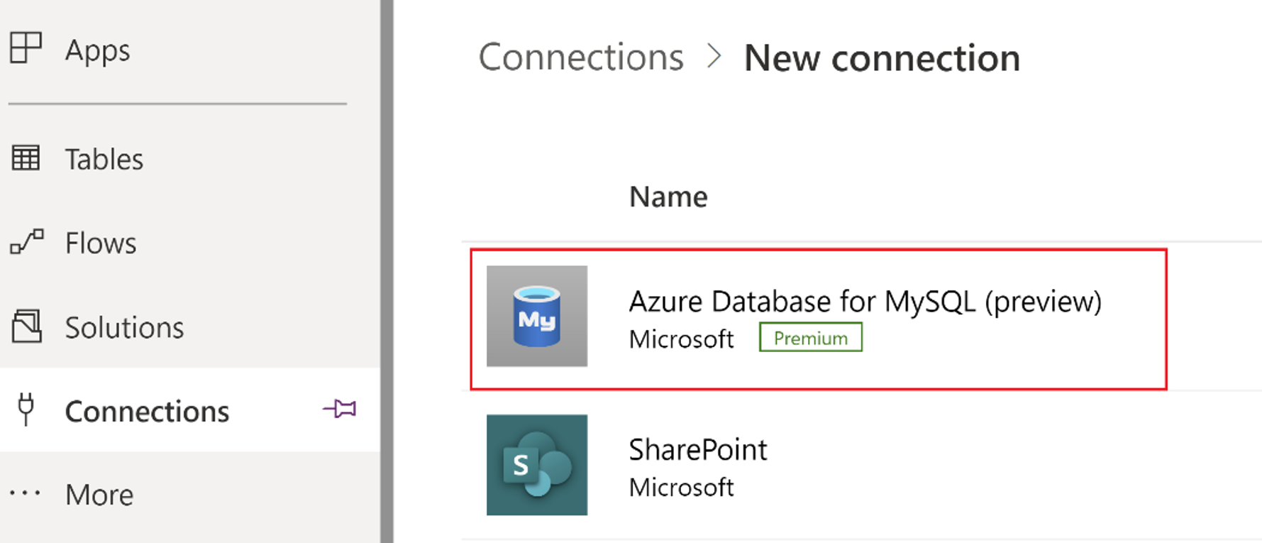 Selecione Banco de dados do Azure para MySQL (visualização) para adicionar uma nova conexão.