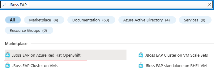 Na barra de pesquisa na parte superior do portal do Azure, digite JBoss EAP. Nos resultados da pesquisa, na seção Marketplace , selecione JBoss EAP no Azure Red Hat OpenShift, conforme mostrado na captura de tela a seguir.